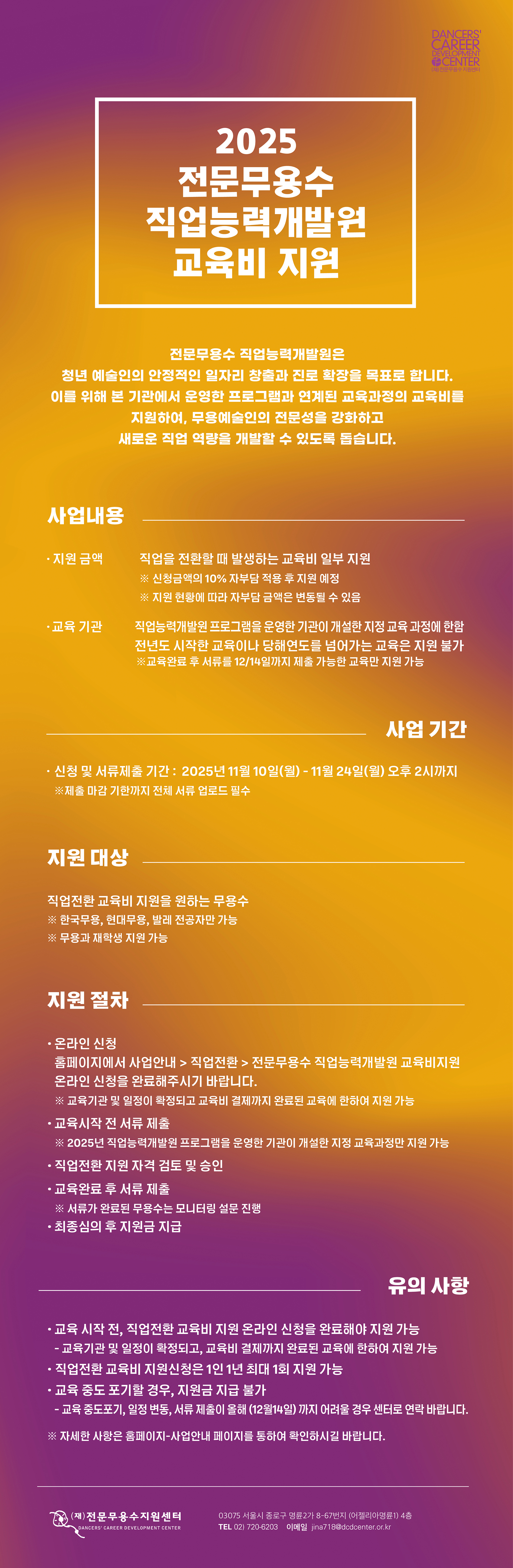 2025 전문무용수 직업능력개발원 교육비지원 사업안내