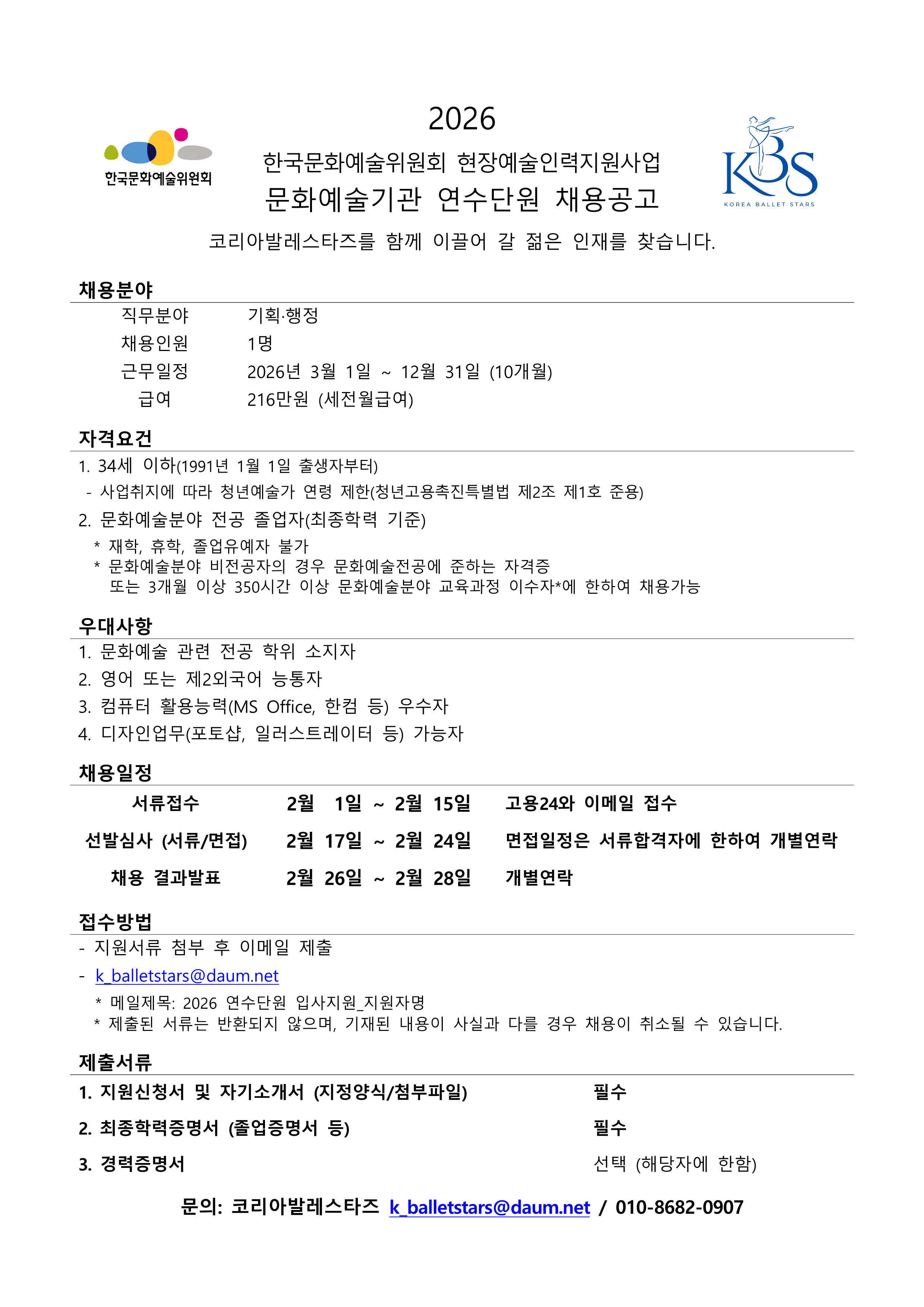 2026 예술기반청년일자리 지원사업_코리아발레스타즈 2026-01-22 조회수 9 2026년 코리아발레스타즈를 이끌어갈 인재를 찾습니다 채용에 필요한 서류 및 공지는 하단에 연결된 홈페이지 주소를 클릭하여 주시길 바랍니다.많은 관심부탁드립니다. 코리아발레스타즈 홈페이지 바로가기