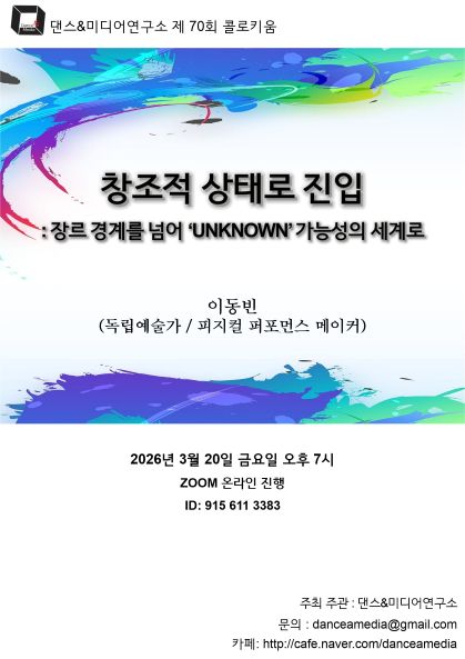 댄스&미디어연구소가 주최·주관하는 제 70회 콜로키움이 개최됩니다.