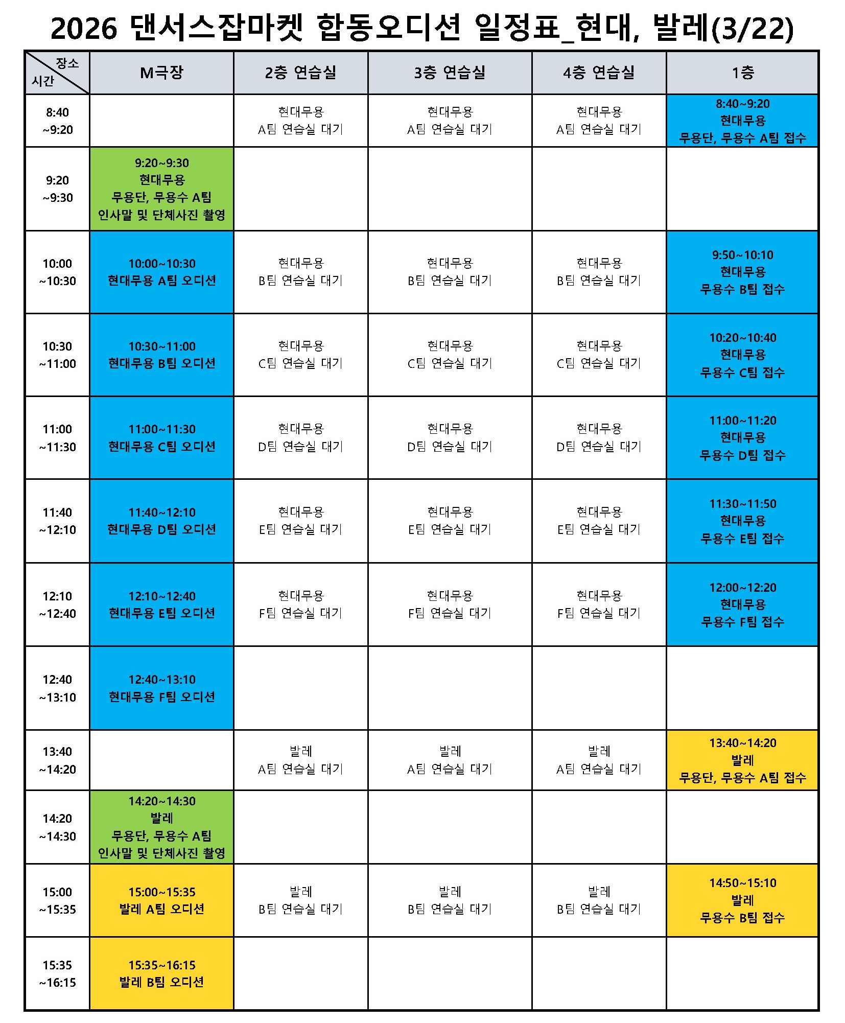 - 무용단은 A팀 접수 시간에 함께 접수하여 마지막에 진행되는 팀의 오디션까지 참관하셔야 합니다.
