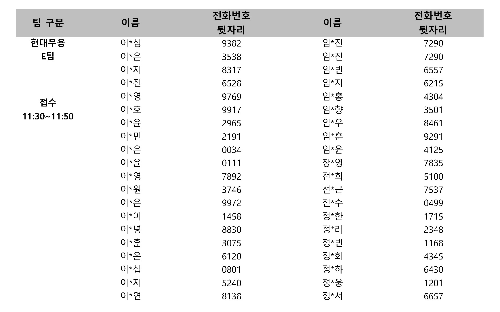 ※ 무용단은 A팀 접수시간에 함께 접수