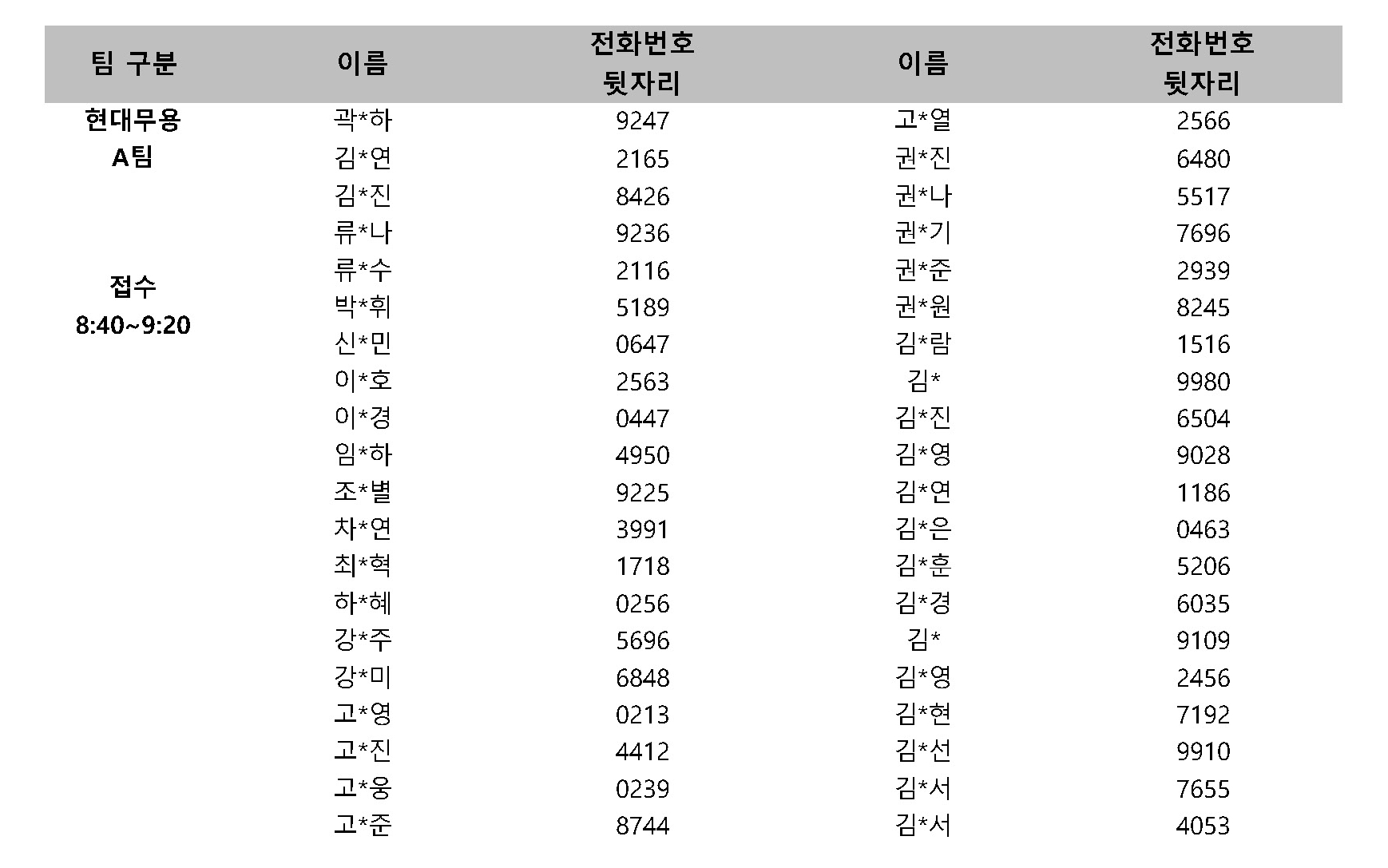※ 무용단은 A팀 접수시간에 함께 접수