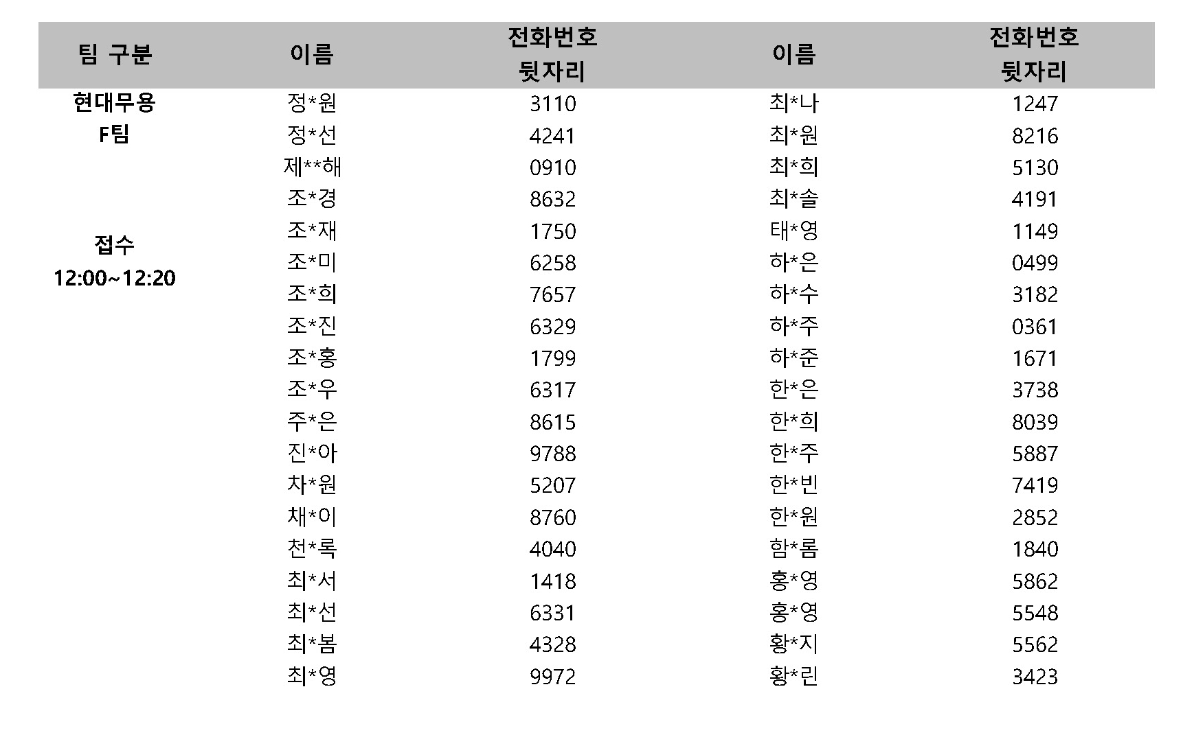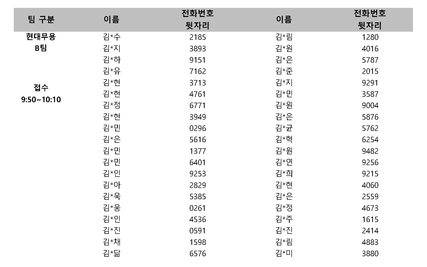 ※ 팀별로 나누어 오디션을 진행하오니 본인이 속한 팀 확인 후 해당 시간에 접수해주시기 바랍니다.