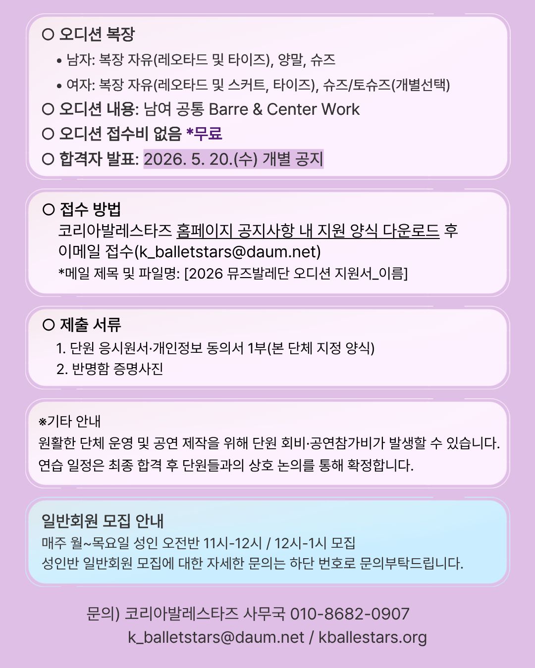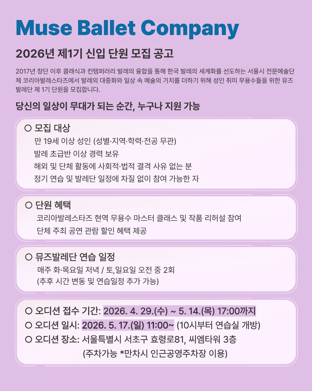 [오디션 공고] 2026 뮤즈발레단 제1기 신입단원 오디션 공고